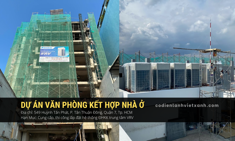 Mới đây, Công Ty TNHH Cơ Điện Lạnh Việt Xanh vinh dự được lựa chọn làm nhà thầu cung cấp và thi công lắp đặt hệ thống máy lạnh trung tâm VRV Daikin cho một công trình nhà ở kết hợp văn phòng cao cấp tại 549 Huỳnh Tấn Phát, Phường Tân Thuận Đông, Quận 7, TP.HCM. Với quy mô 6 tầng, dự án là minh chứng cho năng lực thiết kế, triển khai và thi công chuyên nghiệp mà Việt Xanh không ngừng xây dựng trong hơn 10 năm qua.